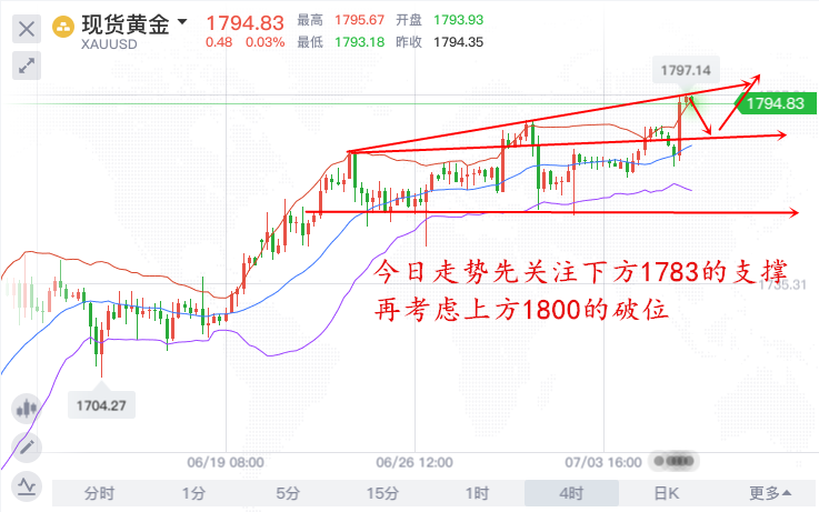 从四小时来看,倒山顶形态被打破,1795-1793的支撑被打破,那么今天的行情整体依旧看多,但是白盘方面占时看一波回撤,上方短暂看1797的破位,不破就是早间我们第一波的操作点位,先主力看多,看下方1783的支撑,支撑不破才是今日看新高突破的机会,若是行情直接到达1780的下方,我们再看新低1774的目标,今日走势方面上方关注1800-1803的压力,上方关注1783-1785的支撑!