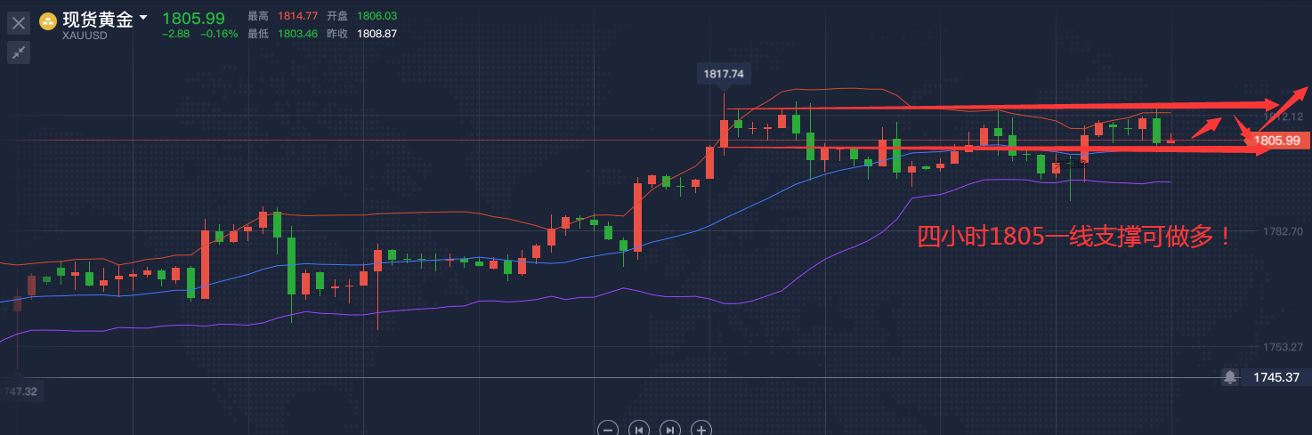 黄金1805-1803一线多单进,目标先看1815-1818一线,目标达到再看回撤,若是行情直接下跌至1810附近,多单不用犹豫之间跟进,再拿利润,这次看破位到1820!