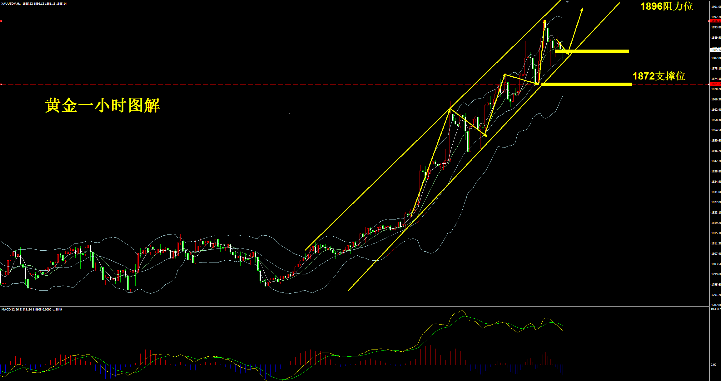 黄金一小时k线运行于上升通道中,低点不断抬高,k线继续运行于布林带中轨上方,即使触碰布林带中轨,也是强力支撑;