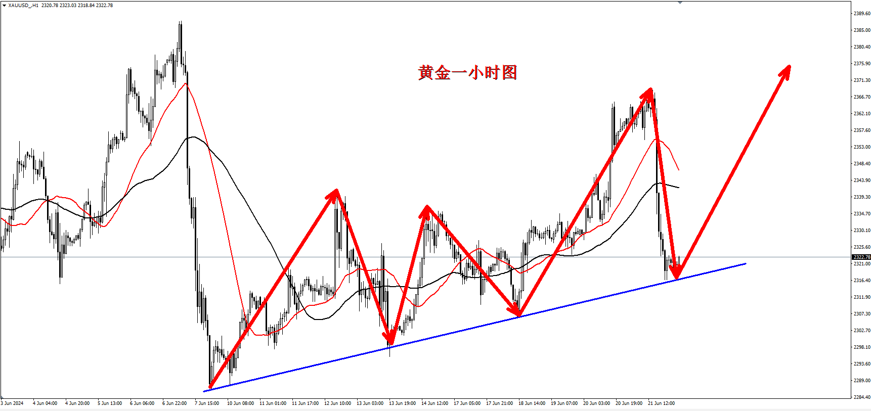 黄金上周五快速下跌,目前一小时线短线触底,短线走出小双底的结构,并且K线开始二连阳拉升,黄金短线很明显是已经跌到位,我们上一篇博文也重点提到,黄金再次下探抵达2316附近还是要做多,因为2316是上行趋势线的重要支撑位!早盘虽然没能够抓到最低黄金点位,但2321一线做多目前也是持仓微利中!多单持仓上方首要关注压力点位2341一线,下方支撑2316,日内做多首先看向2336一线,进一步目标位则是2340附近!