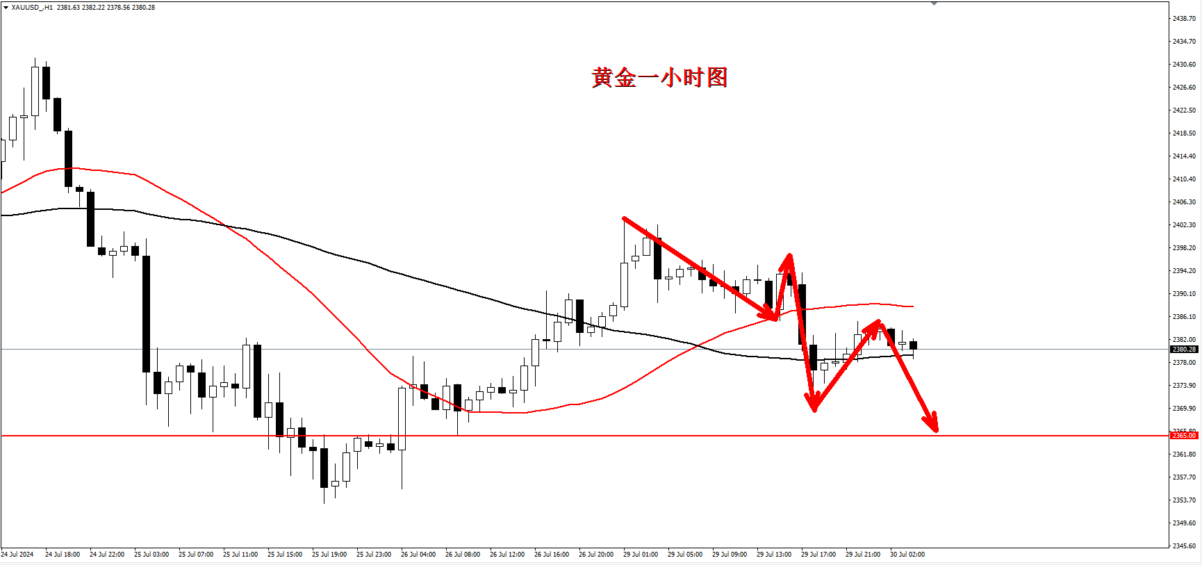 昨夜金价快速下探触底反弹,目前反弹调整的幅度不是很大,今早开盘金价又开始拐头向下发力,并且昨晚我们也重点点明了2365一线支撑位,黄金在抵达下方关键支撑位之前仍是会继续保持着这种弱势的局面,且短期走势仍属于震荡下跌行的格局!但受到底部支撑2365的影响,黄金短期之内跌幅有限,上方压力在2385,早盘即使反弹也是给我们更好的放空点位!早盘2380先空顺势看空,短线目标则是持续看向2365附近!
