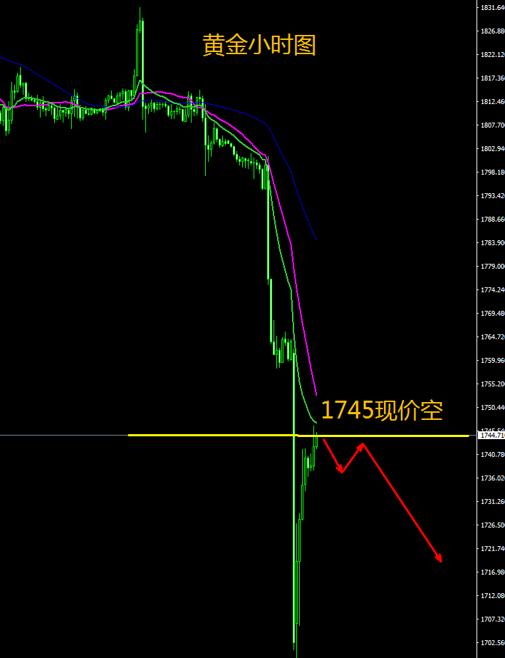 黄金冲高无力,现价1745继续空! 从消息面来看,疫情的影响随着疫苗的普及正在被投资者市场淡化,黄金因为疫情带来的涨幅 必将被剥去,长期利空黄金,美联储的缩减购债的担忧,加息动作时间提前概率增加,也是造 成市场恐慌,利空黄金! 黄金超跌,反弹理解为技术性反弹,早盘反弹已经结束接近尾声,现价1745直接空单进