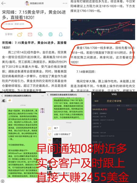 宋阳峰:每天赚上千美金你觉得不可能?因为你没遇到我 7.13做单回顾: 早间1802果断进多,耐心等待1806获利出局!大赚3620美金! 我能够帮助的人只有一类,那就是严格按照我的策略执行到底的朋友!我非常喜欢这类朋友,因为看到你们仓位利润的逐步增加就是我作