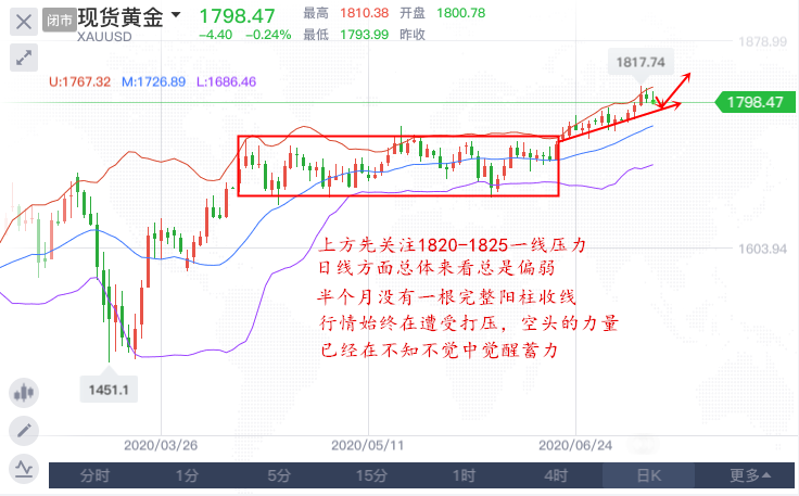 宋阳峰:7.9黄金三日连阳再看高峰,今日具体走势分析! 周三(7月8日)金价周三继续上扬,看涨者抓住黄金上涨势头,将其价格推至9年新高,现货黄金一度高达1818,并准备测试1850上方的目标阻力位。而美元在周三大幅下跌,为大宗商品价格上涨铺平了道路,帮助提振了黄金。避险买盘亦提振金价,因数据显示