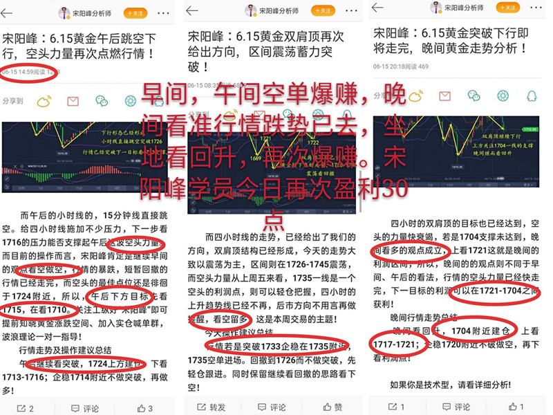 宋阳峰:1730空,32加仓空。炒黄金赚钱就是这么简单,策略跟上了吗? 坦坦荡荡交易,踏踏实实喊单,损是赢的基点,赢是交易的根本!交易的本质是利润,利润的潜在是风险,怕,说明你心里没底,对市场属性不透彻,对市场的下一步该去何从不明确!这条路,绝不会一帆风顺。不论你是害怕,还是谨慎,还是稳健,不论是
