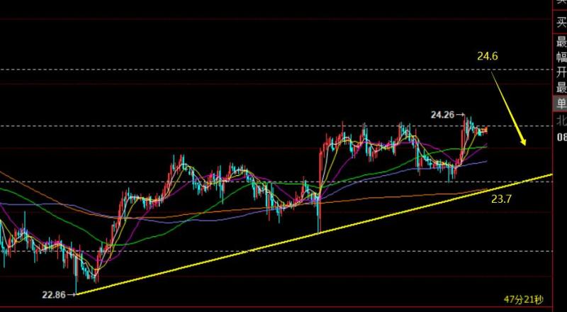 昨晚黄金上串下跳,小非农利多,但依然无法突破站上1820,说明日线年均线压力较大,支撑1800及下也明显,短期内震荡还没出明显方向,建议1820及上压制空,或1800及下支撑多,卡两边运行,规避中间价格带来的被动! 白银24.2仍有阻力,强压24.6下,支撑23.7和23.35,区间运行!
