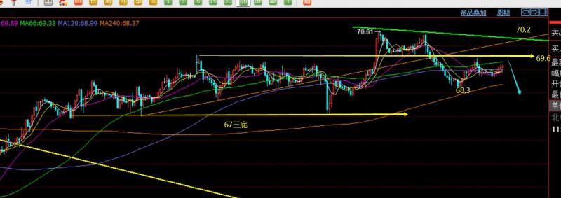 原油方面:昨日符合69.6下压制了一波,只是力度暂时不大,未能破位白盘68.3低点,那么短线它还会震荡下,不管是日线趋势通道承压明显,还是4小时顶背驰明显,后市原油继续看好一波跳水,67位置挡不住,破掉则泄了;如图显示,69.6一线依然是顶底压力,触及高空,支撑68.3和67,耐心持空,等加仓空;原油属于一根筋产品,要么不跌,一旦跌了,就是连续性;前期76.9一线判断指出见顶,跌至65一线;反抽74一线再次指出二次波段看跌,跌至62一线;这一次等待的是又可能是10美元以上的大跌,抓大鱼必须耐心,耐心,再耐心!