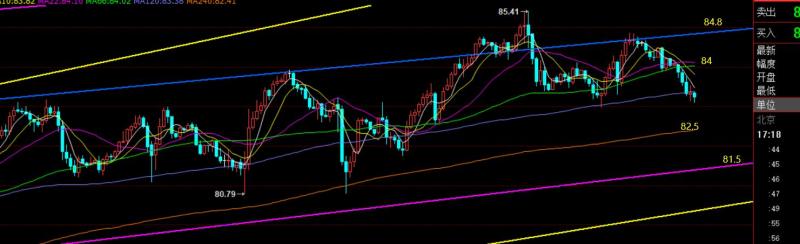 原油方面:昨日符合高位区间整理偏压制回调,隔夜的高点84.6一线,处于通道的再次反压确认,今日白盘一路下挫,证明通道阻力有效,短期会展开一定修正或箱体横盘延续整理,阻力84及上方,通道压力84.8一线,支撑上移82.5,通道支撑上移81.5,关注支撑和阻力之间的运行;