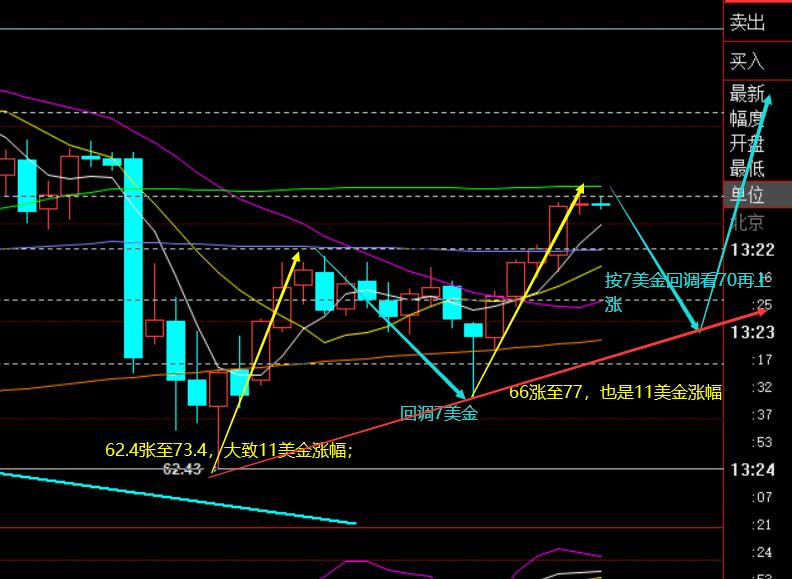 原油方面:昨日强势延续,未回踩给到做多点机会;欧盘连阳破高延续,美盘会有一定二次上行动能,但若22点至23点期间还是无力破高,则容易步入震荡,因此晚间安排了76.4短空,抵达75.8小盈利一波;对于日线级别来看,有一个AB=CD同等涨幅理论,前期62.4涨至73.4,涨幅11美金;这次从66拉升至77,刚好也是11美金;第一波回调是7美金,那么一旦此理论成立,意味着77及上方是风险区域,不宜追高,一旦压制回调,可以修正至70关口,刚好随着时间推移,应该是62.4-66趋势支撑的衍生点;另外,昨日76.5上下指出,它是618分割阻力,压制调整也是自然,结合月线上月是大阴,本月反抽后压制也是常态,但由于已经上涨冲击618分割位置了,后市很难走弱太多,次低点66会大概率成立,因此从波段角度总结就是77及上方波段尝试布空,一般不超过78可持有;后市触及70附近波段尝试布多;