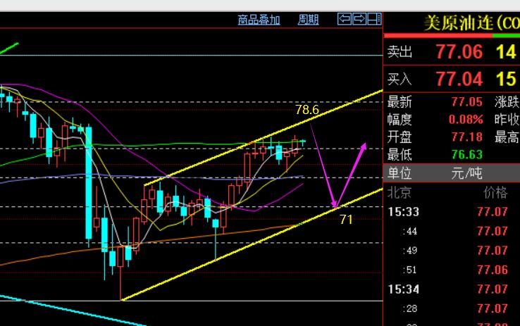 原油方面:昨日整体一日抗跌,从小时线形态看,早盘或欧盘都出现单根K线看跌形态,但每次只短暂下跌一波后又被拉升破高,无法延续下滑,一路推高至77.6一线,半夜收盘前又压制回归77下方;从日线角度来看,还处于一定高位箱体区间来回洗盘震荡,77并未有效站稳,另外按上周通道来结合,上轨强压在78.6一线,也是前期大阴开跌口,此位置下仍建议高空试探为主,同时留意77处能否站稳的问题,短周期都相应出现了一定顶背驰压制迹象,操作上还是坚持77及上方短空为主,波段看跌思路暂时不变;有一点麻烦的就是,上行通道随着震荡时间延续,每次触及上轨的压力高度会逐步抬高,长久下去是不利后期整体的压制,最好最希望的就是这两天得再出现日线一根大阴或长上影受压形态,不能再高位不断抗跌磨下去;