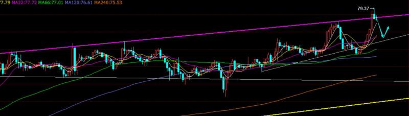 原油方面:隔夜又一次依托通道上轨阻力78.5狙击一次高空,早间醒来已经77抵达盈利;今日早盘77.6下承压先看续跌,给出77.3短空,抵达76.7获利,但可惜76.5一线关键起涨点破位不了,则还是步入高位的反复洗盘走法,每一次洗价格都会逐步破高,去试探通道上轨阻力;美盘前的急拉刺破了78.8上轨阻力,但现在认为刺破概率存在,因为5分钟级别高位78.8-79.3横盘后往下破位了,且每次高位下跌的时间都选择在美盘期间,因此建议78.8-78.9尝试高空,破高损,短线抓100点收割;