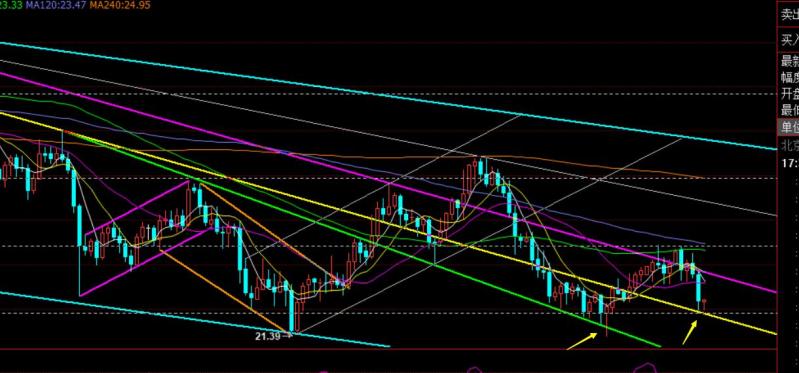 上图是白银日线走势,从通道角度看,23.4高位压制跌了一波,回踩确认了黄色线22-21.8一线,此位置等同于黄金1787-84一样,能守住则维持黄色和紫色两趋势线之间的区间震荡,即22.75-21.8;守不住则有可能再次测试21.4底部;