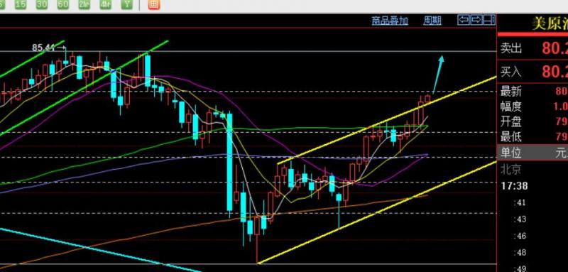 上图是原油日线走势,昨日大阳收盘站上了黄色通道的上轨阻力79一线,那么意味着油价可能要强势上涨延续一波,有望再试探85一线前高,这是按照AB=CD同等涨幅来计算,62.3至73.3、66至77、74.2至?,这个问号按照11美金涨幅来算,就是85.2,稍微或有些误差,大致每一波都是11美金涨幅;上周多次依托黄色通道上轨触及高空,每一波都有100-200回测空间利润,而惋惜的是并未压制住,去回测试探通道的下轨点70-71一线;既然选择强势上破,则顺势强势去跟多,看第三轮的11美金上攻;