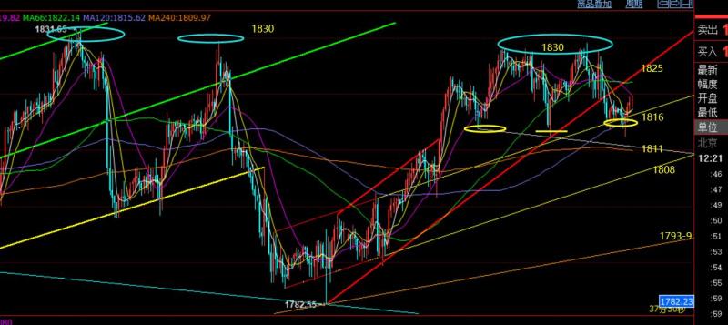 第四,黄金小时线级别:隔夜震荡持续走跌一波,今日早盘先续跌,刺破隔夜低点后走反弹上攻,这个走法已讲过多次,作为震荡行情中,延续性是最差的,早盘先跌,不管是支撑隔夜低点还是刺破隔夜低点,只要出现探底企稳形态,则容易走反弹,也是低多的时机,这也是早盘给学员布局1814短多的原因;当前在测试凌晨横盘阻力以及顶底阻力1819-1820,站上则会有所转多发展,上方还有一个通道反压点1823-25,要站上它才能再次试探1830逢高多重顶;图中,下方也有多处通道支撑,分别是1816、1811、1808、1793-94,这和日线解读的支撑基本共振,支撑和阻力之间没有大幅度的破位走出前,预计短期内还将继续来回整理;