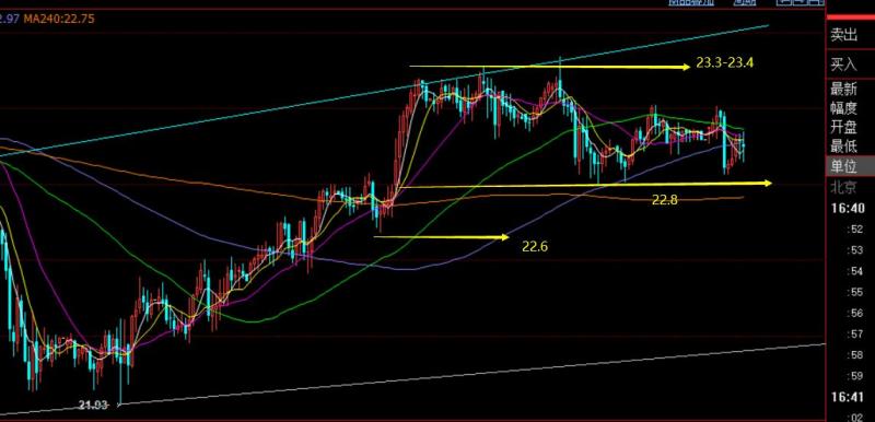 第四,白银方面,也不多讲了,由于震荡缩尾,波幅区间逐步小,今日暂时白盘不计划下手,关注22.8一线支撑,强支撑22.6,阻力23.1和23.3-23.4,区间内运行,等美盘再看;白天走来走去,到现在才0.2上下波幅,不好下手;