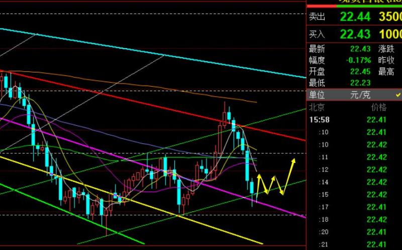 白银方面:日线连阴下滑,短期依旧弱势,不过日线级别,处于紫色和绿色两趋势交叉支撑,前期22一线起涨点或存在双底一定支撑作用,同样低位不宜再追空,建议22上方逢低适当先做多试探,短期5均线和10均线区域是强压,修正到位可继续放空,大致关注23-23.4区域;