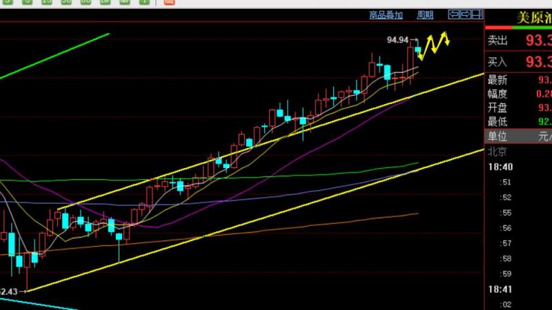 对于本周来讲,日线大阳拔起后,同样高位会余温拉升,至少周初会维持高位偏强运行,回测短多为主,支撑92.75和92.1-92.2触及多,阻力暂时94.9-95一线,后续几日预计还会破高,至于高度哪里,目前通道来看,周期不够,尚无法推断;今日早盘先安排了94.5下短空,可惜出于谨慎保护,下移止损于94.5,刚刺破后才大跌抵达92.75目标,错失了一波;今晚就建议支撑逢低多安排为主;