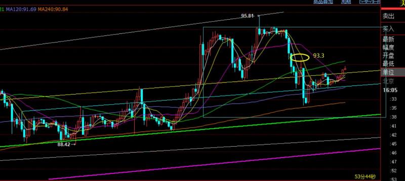 此时反弹有所突破早间高点,那么不急下手,从日线级别看,还是偏强运行,10均线无法有效破位失守,有可能还会维持高位的来回运行,支撑关注91-90,强压关注95-96,暂时围绕此大区间内运行对待;原油走势波幅都过大,不过它有一个个性就是连续性会不错,一旦反弹,就一路上攻;一旦打压,则一步到位;当前阻力关注下93.3一线承压如何,若突破则大概率是93-90区间内的反复运行了;操作上,尽量保持区间内的高低操作,90上逢低多,95上逢高空,中轴位置关注93.3压制情况再布局;