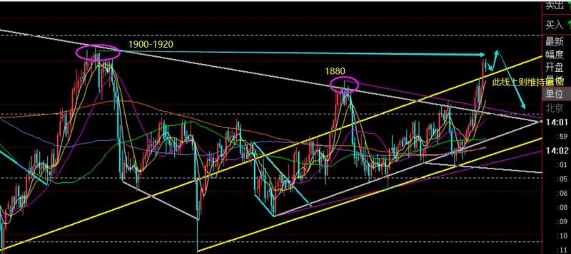 操作上:隔夜1900下空,早间1888低位减持后,防守可下移1894即可,做好风控,这几日消息面较多,不确定干扰因素也多;若1888继续下破,可反弹1890上再计划短空试探,看1884-1878区域得失情况; 反之,若突破1894上行,则可能还会触及1900上方,届时耐心等待顶背驰出现刺破1902后择机再尝试高空;