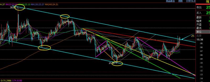 白银方面,从日线看,大级别的通道上轨已经有所突破,今日需要观察能否站稳的情况,也即是25一线,若今日继续收阳,且价格远于25上,则冲击26概率就增大,甚至26.7; 反之,收阴回归于通道阻力25下,则围绕蓝色和红色两线之间继续偏强震荡上行运行来对待,那样耐心等10均线24.3上逢低去安排低多;思路上和黄金一样,只要守住日线10支撑,整体偏强上涨多头保持不变,做多为主;