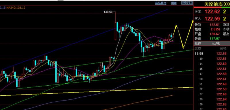 原油方面,日线昨日收报较长上影K线,那么130关口会暂时承压下,不过趋势上和金银一样,逼空强势,后续几日预计会震荡回补长上影,短期支撑116.4早盘未触及,短期阻力关注124.8,此位置处于昨日跌幅反抽618阻力,作为波动率较大的原油,只能卡关键618阻力或支撑来安排;当前支撑有所上移117.5,此位置上逢低看上行,关注117.5-124.8区间内得失情况;