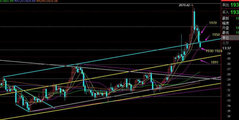 第二,黄金小时线级别,隔夜一路压制10日震荡下跌,这种走法就是阴跌,给不到好的反弹做空点,也给不到短多的目标点,刚好和前期的逼空强势不回测形成反差;而今日早间开盘直接延续了这种阴跌,原本计划依托凌晨高点1960上去短空测试,也就无望了;当10点大阴失守隔夜低点后,走弱就显得更加明显,但手中没有相对高位的空单持仓,直接去低位追空也就缺乏一定胆量了,这和前期逼空强势拉升,不敢直接追多都是一个道理,心理上的一道坎;当前价格最低触及1924-25,这个位置是处于1780涨至2070回测的50分割点,具备一定支撑作用,上周1959是382分割支撑点,也反抽过一波;可围绕1924-25轻仓逢低测试下短多,看支撑力度如何,也是希望能出现一波修正至1950上,如此才能有好的相对位置去反手顺势跟空;当然,在这种一路阴跌丝毫不反弹的走势下,去做多偏激进,仓位一定要轻尝试;若1924-25守不住,则欧美盘只能考虑极弱去直接跟空,或者继续观望看戏,等出现一波修正后再介入做空;