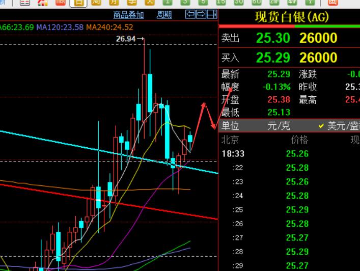 第二,白银方面,24.5逢低多,最高逼近25.5下,也拿下一波,作为纸白银持仓,可继续持有看,适当减持保护,防守上移本钱即可;而作为杠杆白银持仓的,基本一波拉升利润不错了,择机逢高收割或减仓大部分保护去博;