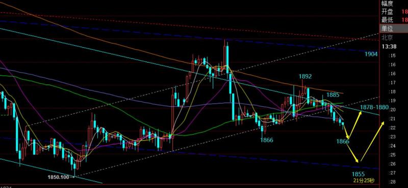 黄金方面,周线上周收报一根长下影K线,刺破中轨回归上方,且价格还处于前期缩口三角破位之上方,中期维持多头不变,只是均线处于短期10日之下,并未强势运行,而是偏多运行;日线级别上,上周支撑1850出现一波反弹修正上攻,借助美联储加息落地之后的“卖事实”反推动,但可惜这次美元承压下跌仅仅只是一个晚上而已,并未历史平均上的一两周时间,价格冲击站稳10均线失败,重回底部弱势运行;但是,近期地缘局势依然很紧张,全球通胀依然很严重,黄金作为抵抗通胀以及具备避险的产品,随时会得以发挥作用,预计日线技术上是再一次通过底部震荡酝酿来短期筑底,从2000关口跌至1850,途中两次较大反弹都未持续太久,等待第三次反弹的冲击;小时线级别,早盘从1885开始压制,延续5均线慢跌向下,失守了上周两通道短期支撑1878,也破位上周五美盘起涨点,则有延续下滑动能,不过macd会随时处于底背驰而反抽,关注1866附近双底概率多,强支撑留意1855下一个通道支撑也是测试多,阻力关注1880-78,重新站上则上看1885、1892,强压1904下高空为主;