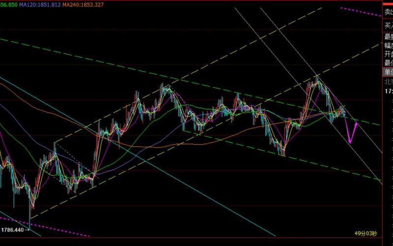 小时线级别,隔夜弱势打压,今日早盘并未先续跌,也就没有较好入场低位做多机会,那么直接先震荡反弹修正,则欧盘前后要先去空一次,参考位置首先选择隔夜跌幅382分割阻力,刚好也是最后大阴开跌口1856一线,强压风水岭是618分割位置1862-63一线;同时要关注欧盘期间,能否跌破隔夜低点来看待美盘强弱之关键;若美盘前失守1846,则晚间先反弹还有二次压制下滑需求看弱势;反之,若坚守1846不破,则美盘最多是看探底拉升,容易走上攻;从macd指标来看,价格拉低容易形成底背驰,拉低是不好直接破位去追空的,容易造成空间不大而点位入场被动,加上这几日震荡频率大,延续性差,破新低后反而是等待企稳做多机会;
