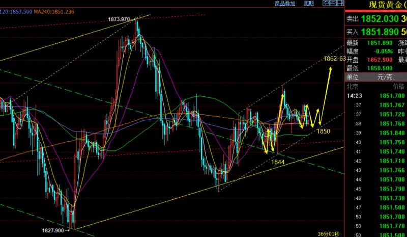 第一,黄金方面,周二隔夜探底拉升,昨日早盘先压制下滑,并未续涨,那么午后或欧盘就必须跟多一次,而做多点参考几个位置:一个是凌晨低点1849一线,一个是通道回踩点1846一线,一个是618分割支撑1844一线,都是触及做多点,陆续试探干多,虽欧盘期间围绕1846-1851这5美金反复震荡,但并未失守早盘低点走延续,同时美盘前出现一波拉升,这意味着美盘后先跌容易产生诱空局面,最终顺利拉升抵达1856、1860;