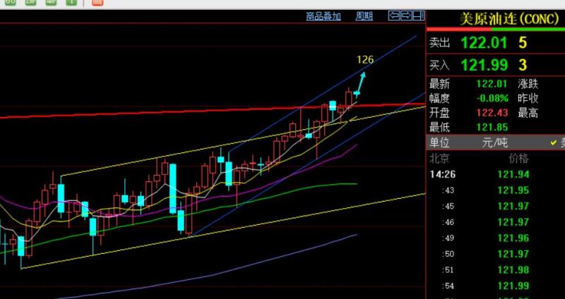 原油方面,昨日继续逼空强拉破高,站稳120冲击123高度,日线和周线延续短期均线连阳上行,短期内逼空格局还是很强烈,保持顺势看涨;从日线级别看,前期黄色上行通道已经完全被站上,进一步演变为蓝色上行通道,坡度越来越陡 ,一旦再出现第三个更陡的上行通道后,就要时刻小心逼空结束后的大幅跳水修正,这个通道规律前期视频中讲过几次;此时还属于第二通道发展,继续保持逼空涨对待;回测关注121.3-121一线顶底位置逢低多,阻力123和126;强支撑120上逢低也是做多参考点;
