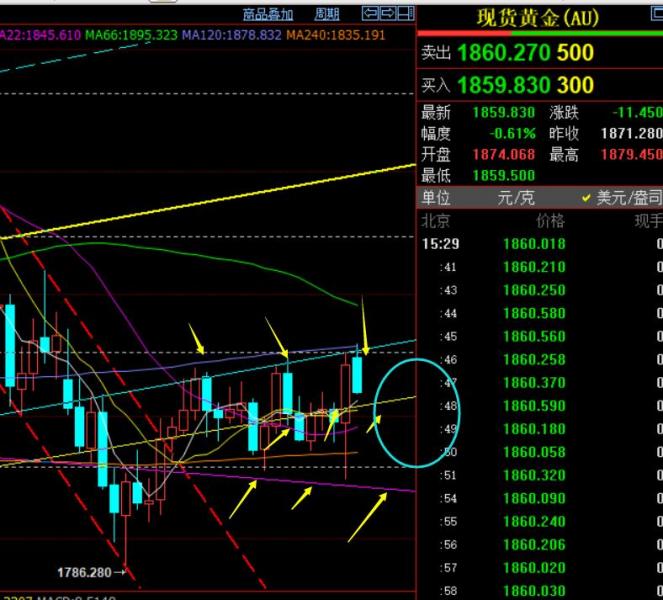 第三,黄金小时线级别:隔夜大幅拉升,今日开盘跳水先高开续涨,而作为震荡反复走法中,早间延续性是较差的,且1878一线是卡在一定通道上轨承压中,因此一早就提示1876-78直接空,周末分析思路中也早已提示此阻力,回踩最低1860一线,比预想的要干脆;而亚盘下跌一波,午后横盘反弹无力,则欧盘存在进一步的下跌,1876一线属于顶底位置,也是10均线承压,同时是前期分割压力位,这里承压就向下再看1850-45区域,它是下方均线密集处,也是多处通道回踩确认点,同时隔夜涨幅回测618分割位置上也是作为震荡的极限下调点;