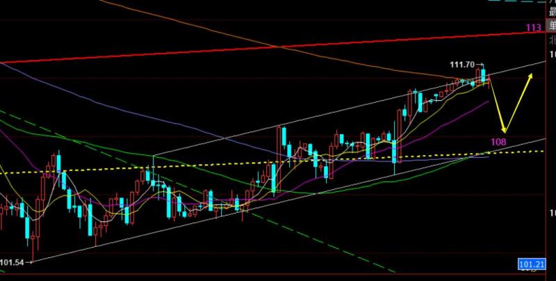 原油方面:经过底部几日的震荡反复缓慢酝酿整理,昨日终于延续上攻一波,日线开始连阳,回归于前期上行通道之内,周线也逐步展开宽幅震荡的迹象,预计后市指向115、119概率会逐步加大;昨日盘中只给出一单,106.8的多单,今日已经拉升至111.7高度,千万别小看原油的波动率,一旦打开,走几百点只是一两日的事情;