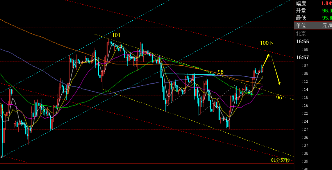 操作思路上:100下高空,看目标支撑97-96,下破日内新低再看延续下跌;
