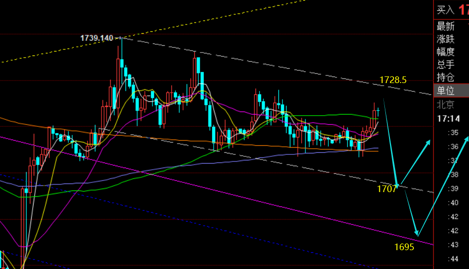 操作思路上:1728下仍高空看压制回测,目标支撑1715、1707; 1707-1700区域再考虑低多,同时配合时间节点,公布前后去参与;