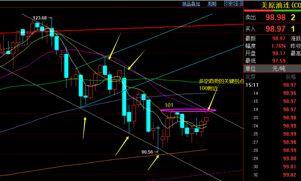 首先看下原油日线走势图,当前还处于下降通道内,而上轨压力逐步逼近,处于100附近关口,今日务必留意此位置的得失情况;若大阳远站上100上方,则两月以来的压制下跌则结束,后市转为短期多头上攻;反之,压制100关口,收报较长上影K,或直接反阴K,则通道承压依旧有效,后市继续维持压制下跌;