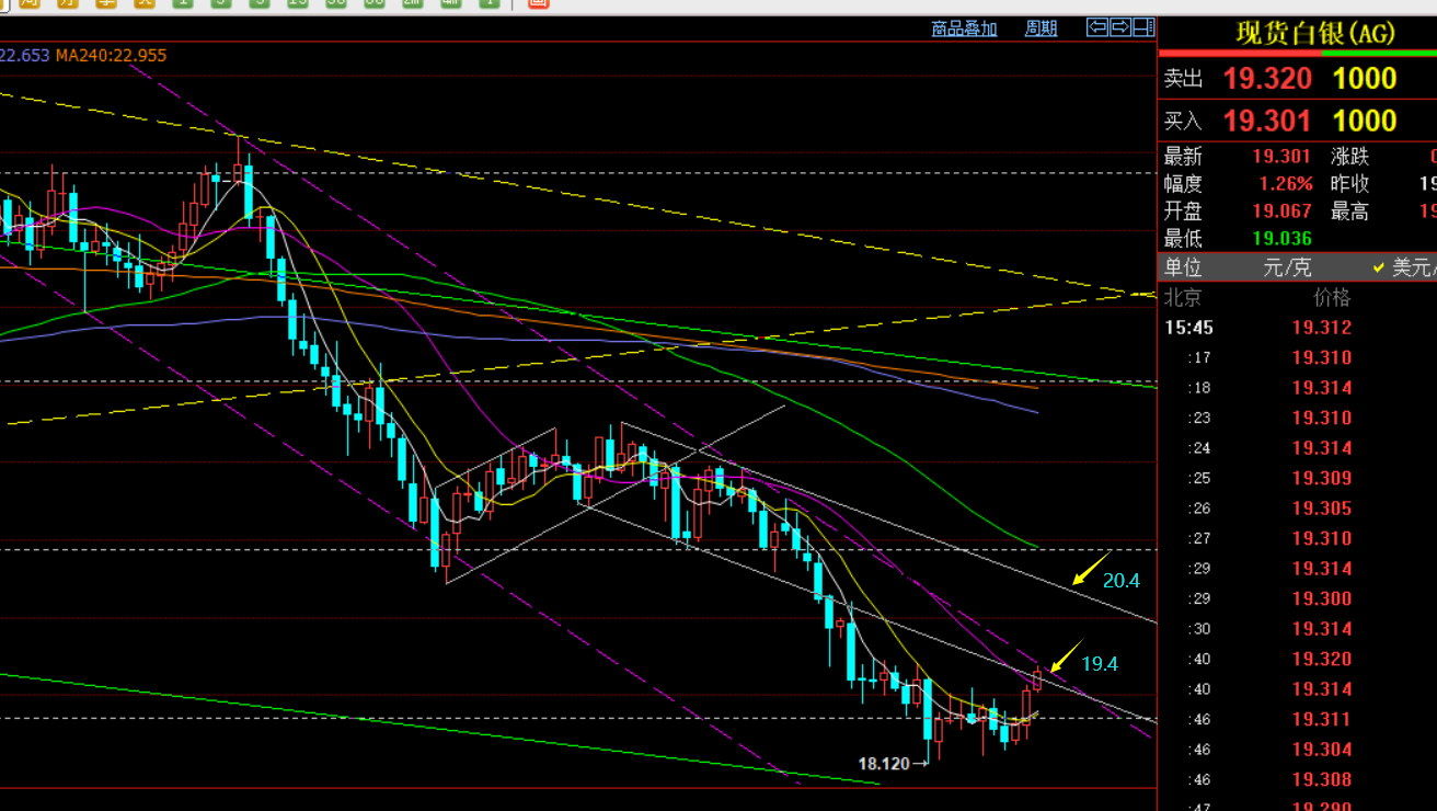 白银方面: 当前日线图中,紫色下降通道阻力在19.45一线,这里也是前期大跌后一直横盘整理过不去的坎,其次是20.4白色通道阻力,同时也是周线10均线压力;因此,短期压力留意19.45,中期压力留意20.4处,拉升也只能作为反弹修正,至于力度有多大,要看美联储对于9月份加息态度如何,以及市场对于经济衰退的炒作;
