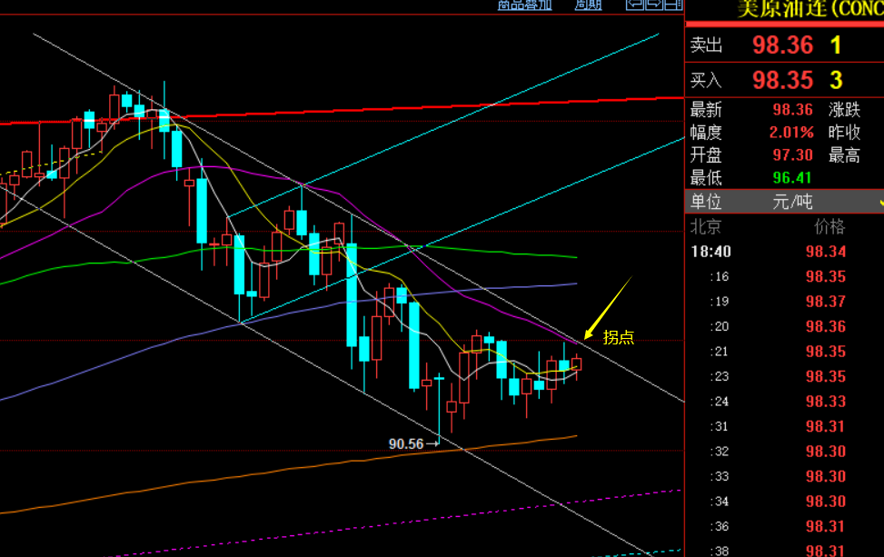 上图是原油日线级别:还是顶住此下降通道,上轨压力99.6一线,未站上前,还是保持整体震荡压制;站上了,再去改变思路去转多看涨;另外,本周一天一个样,阴阳切换很有规律;