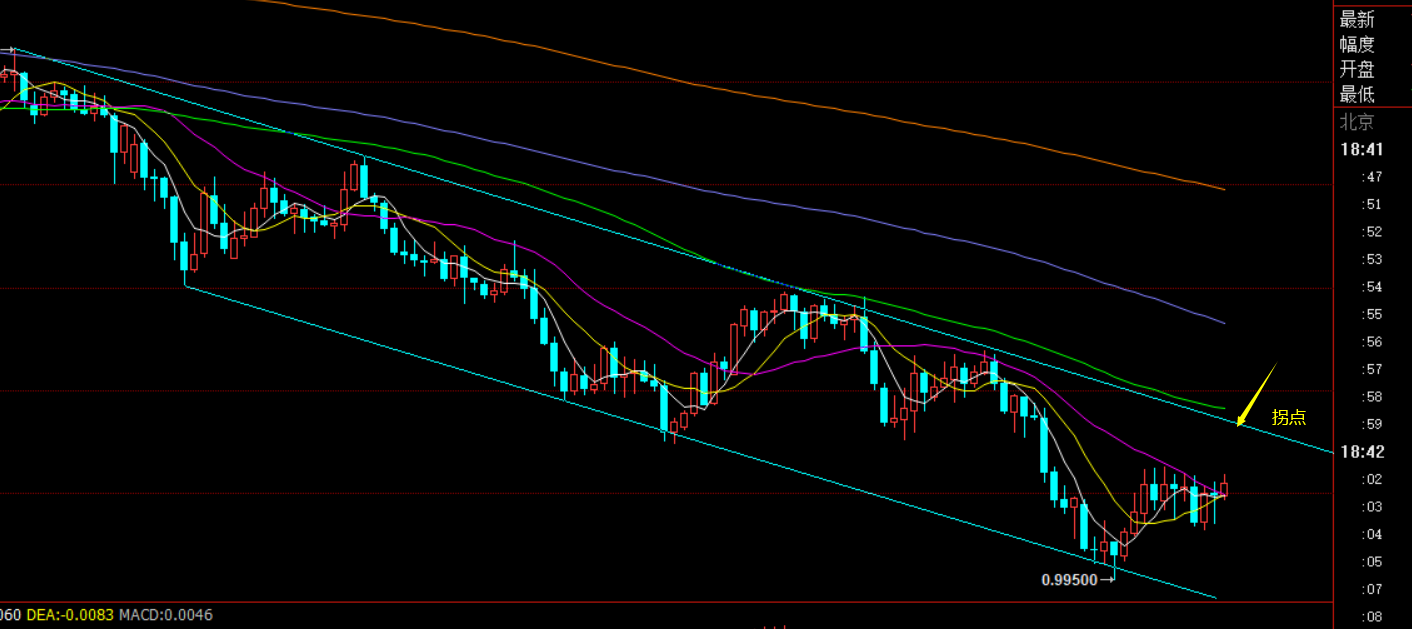 上图是英镑日线级别: 也是下降通道,只是即将测试上轨1.228处,触及可参与空试探承压如何;站上了,则会一定程度上展开进一步的反弹上攻;站不稳,则继续通道内压制为主;
