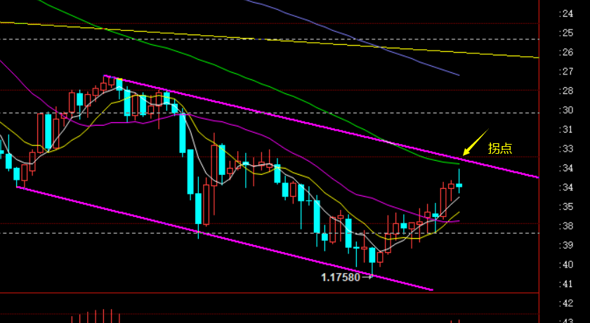 上图是欧元日线级别:留意通道上轨,也是下一个波段做空点,大概1.038-1.040附近,触及可把握,此通道运行还是相当规范;