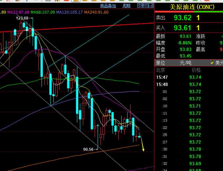 原油方面:日线收报阳十字K,算继续循环阴阳走法,那么今日收阴就是大概率,而短期仍处于下降通道内,继续反弹空为主,波段持空等待; 隔夜压制96.45冲高回测,按照分割角度和通道反压共振,95.3-95.5依然有压力,此位置下继续空,支撑92.4,一旦失守则试探前低90.5,而周线通道下轨支撑还有些远,在82-83位置;