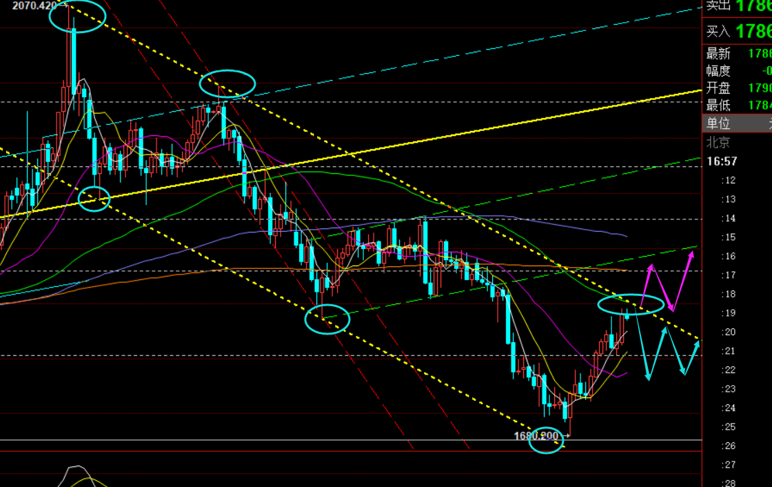 第一,黄金方面:昨日持续拉升,收报大阳,且突破了1788前高,当前即将逼近2070-1998大级别下降通道的上轨承压处1800-02一线,这里将是决定短期多空趋势的拐点变化;若承压不上,且出大阴回测,则继续维持短期空头,这轮1680起来的反弹也就终结,展开八月区间性往复震荡;若突破站上此通道继续阳线拉升,则短期压制结束,展开进一步的上攻,甚至逐步转多发展;