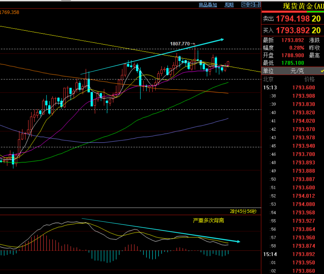 第一,黄金方面:昨日仍围绕一点,4小时macd依旧处于严重顶背离状态,价格拉高依旧会冲高回落,而背离的最后结果,基本都是迟早会大幅下探来修复,背离时间越久,后期下跌力度会越大越持久,因此昨日依托前晚跌幅618分割阻力,1798两次触及都是反复做空,夜间最低下探1785一线;