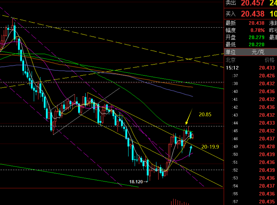 第二,白银方面:这两日指出运行区间锁定20.85-20之间,靠边参与;