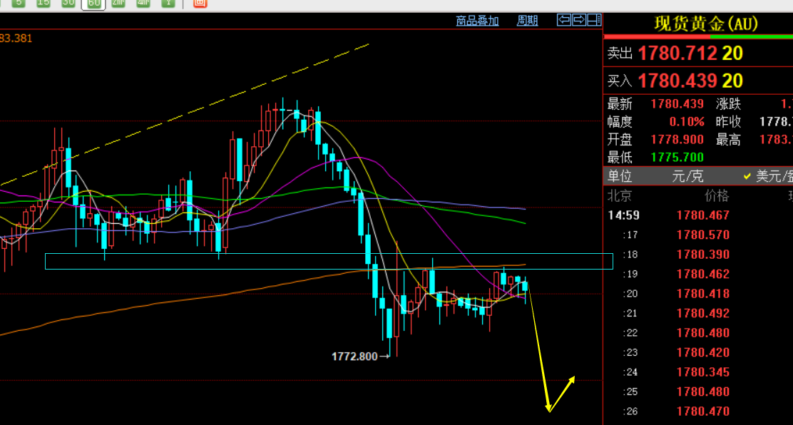 第一,黄金方面:昨日早间横盘压制隔夜1802高点,一路连跌下滑,美盘20点前触及1772一线低点,中途没有出现任何的阳K线;阴跌慢跌之后,美盘后先出现急拉则往往是诱多,顺利迎来二次下跌,而半夜无法再破新低,则步入了窄幅低位压制整理;