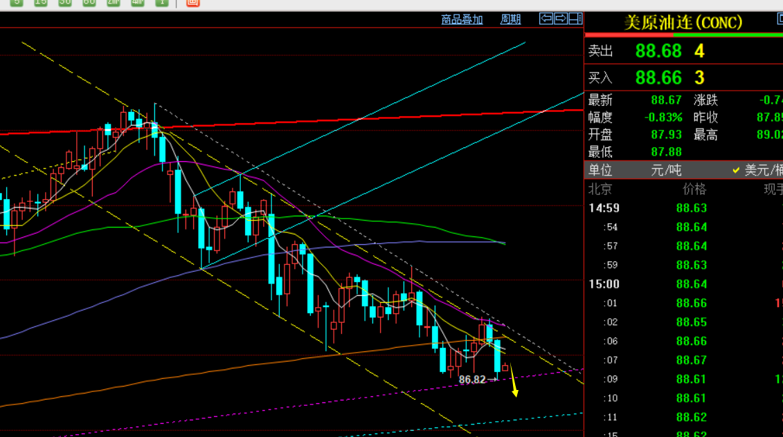 原油方面:日线连续大阴,符合波段看跌思路,当盘中价格击穿91.2前低点,也是通道支撑后,果断小幅反弹91.5下直接空,晚间最低下探86.8一线;美盘反弹一波,计划618分割阻力89.8下继续看跌压制,半夜最高89.6受阻回落至88下方,再次符合思路和方向预判;