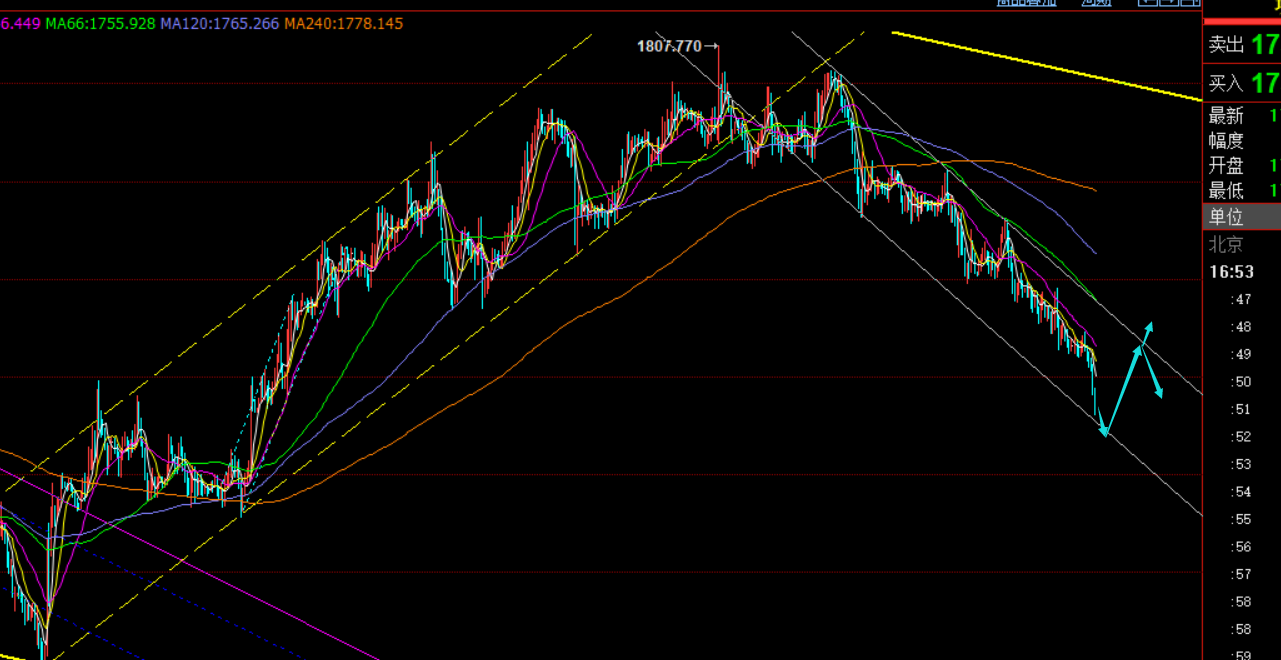 第四,黄金小时线级别:今日原本计划靠近短期下降通道上轨阻力1756下继续空它,但它直接走弱慢跌下去了,1750都无法试探,当前连阴局面中,要先参与空,只能提前去试探,短期阻力下移1740上,支撑还是1729,既是下轨支撑点,也是618分割点;当然,这种阴跌持续下滑的状态,去逆势博多反弹也需要很大的勇气,必须关键位置才能考虑试探,一旦失败,就最好不能轻易再尝试第二次,市场都容易走极端,做好风控第一;