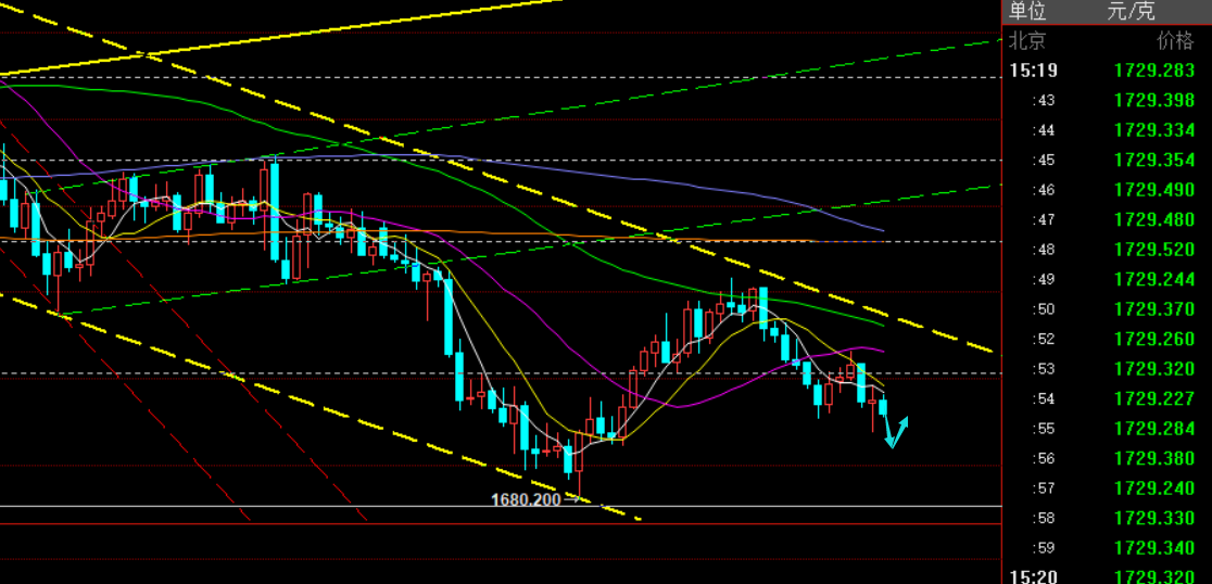 第三,黄金小时线级别:隔夜探底拉升,今日早盘先震荡压制,按这个走法,日内回测是跟多的,不过前面的趋势是处于1765压制下跌,因此,需要重点关注欧盘期间,回测企稳拉升的力度如何;若无法越过1745隔夜高点,则还会再度下跌,届时会试探隔夜低点1720,甚至下穿;反之,只有突破站上1745,才能延续隔夜的反弹上行;那么回测企稳的参考点,一般在震荡行情中,是看618分割位置的,即1729一线,但个人不太建议此处去试探多,因为日线级别来讲,还是倾向于震荡压制的,也是概率出现类似四五月份的循环反复走法,就是昨日上涨,第二日不延续,反而收阴吞没,第三日才会反弹,阴阳震荡走法;另外,从通道角度,当前阻力下移1740一线,支撑1727一线,看此区间内得失,若失守1727,则下一个通道支撑是1718一线;而当价格刺破隔夜低点,macd会步入底背离而探底拉升;总之,今日的预判走势大致是先压制跌,再破底后探底拉升,步入多空的反复震荡格局,延续性会差;