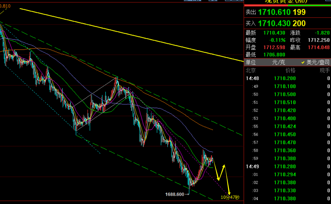 黄金操作思路: 1717下看压制下行,支撑目标1700下方;
