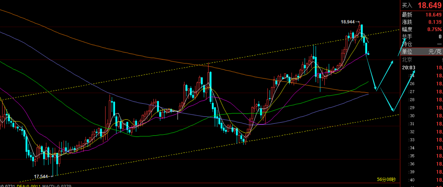 日线级别走势比黄金强,试探了中轨19一线下,短期均线金叉,它已经展开了反弹修正,但也会区间内反复的,18.3一线支撑,19阻力,今晚关注这个区间内,强支撑18一线,日线10均线既然突破站上,短期也不能继续看弱势格局,而看区间内反复震荡缓慢偏反弹,18-18.3区域稳定可以考虑低多,19下看压制;